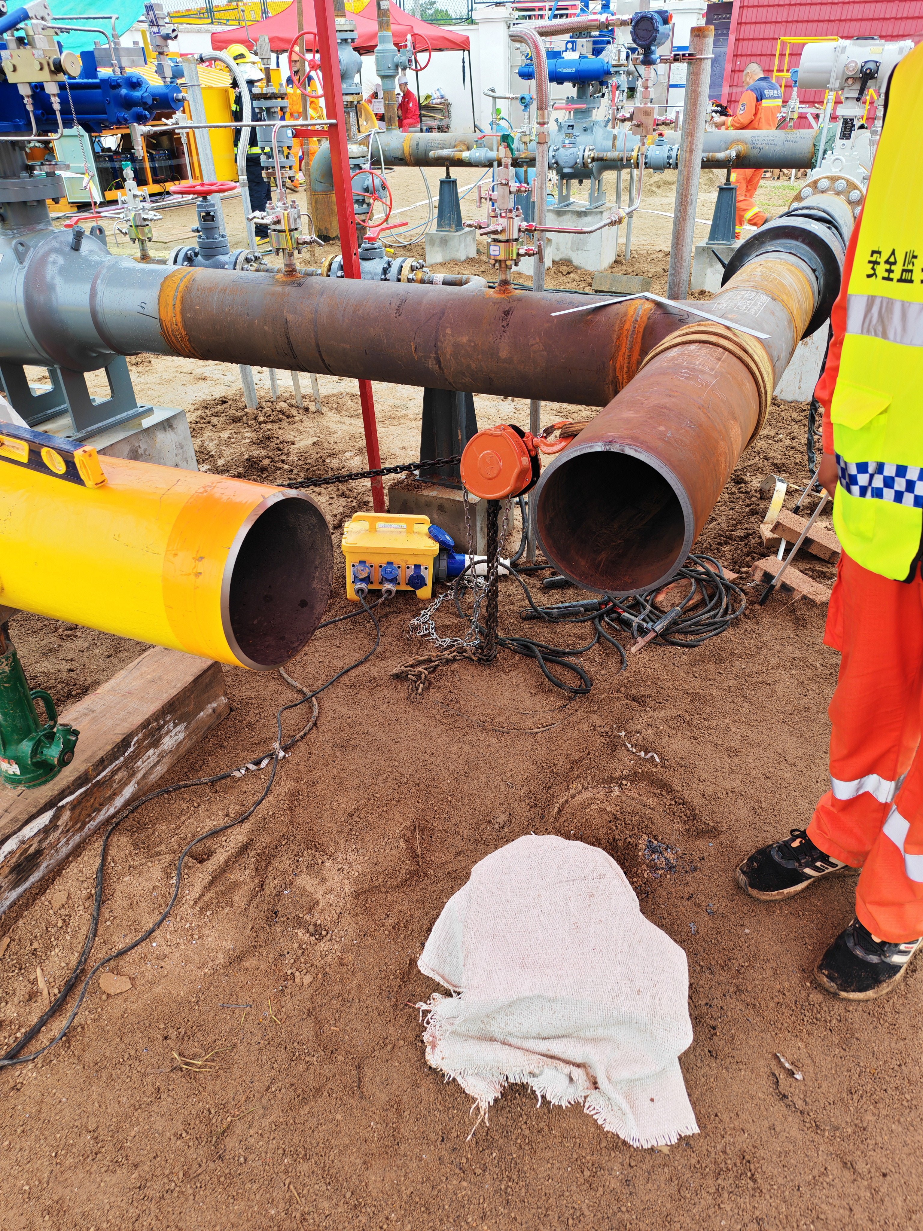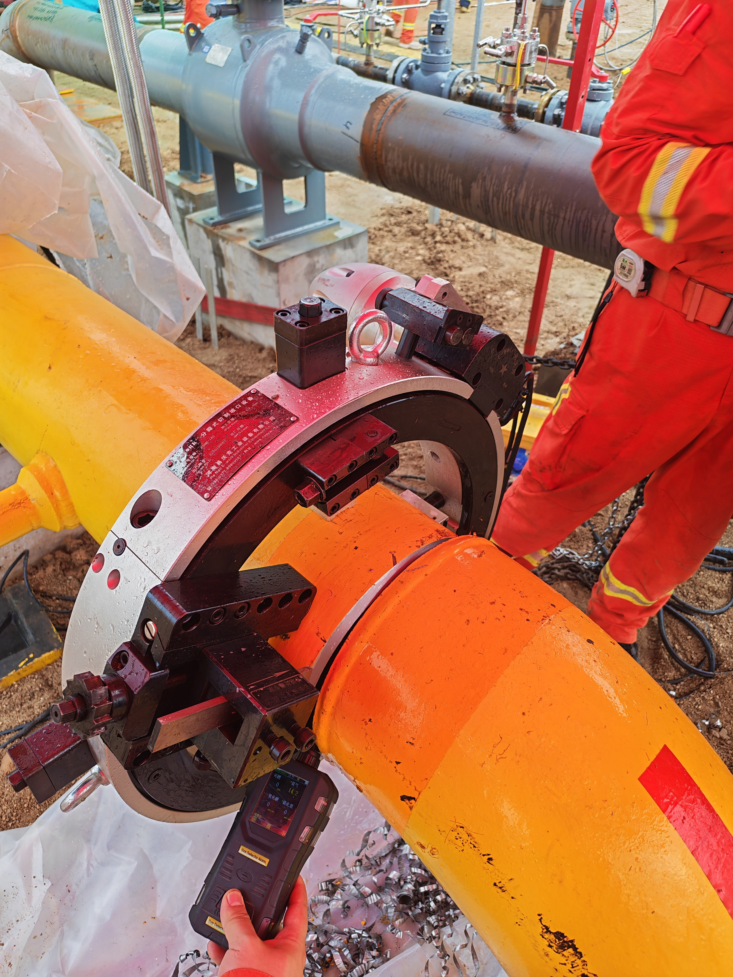 作業(yè)區(qū)域:管道冷切割切除原彎頭,拆除13米DN250管段。焊接2道彎頭焊口,并和新建分輸支路管線連接,作業(yè)點高度0.8米,采用易沃克分瓣式切割坡口機現(xiàn)場斷管作業(yè)